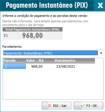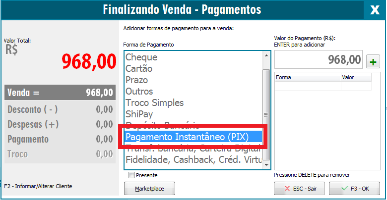 Ao finalizar a venda, escolha a forma de pagamento que deseja, exemplo, PIX e pressione F3 para adicionar o pagamento: