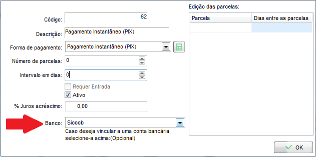 Localize o parcelamento em questão (No exemplo, utilizaremos o PIX), e clique duas vezes no mesmo, aqui você poderá definir um Banco para destinar o valor do pagamento, caso deixe em branco, o valor irá para o Caixa Geral;