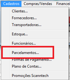 Primeiramente é necessário configurar a Forma/Meio de pagamento, para isso, acesse o Clipp e clique em Cadastros - Parcelamentos;