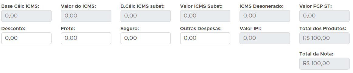 Na aba de impostos você poderá visualizar os impostos calculados automaticamente, ou preenchidos manualmente conforme procedimento anterior nos produtos. Também poderá lançar os dados de Desconto, Frete, seguro e Outras despesas;