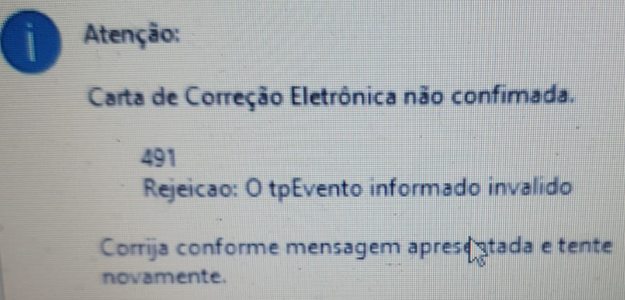 Ao realizar uma carta de correção eletrônica, ocorre a mensagem: