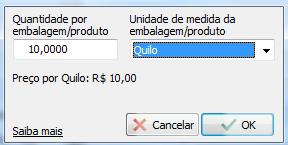 Preencha a quantidade contida na embalagem e a unidade de medida dessa embalagem, automaticamente o sistema definirá o preço por quilo, com base no preço de venda preenchido no cadastro do item.