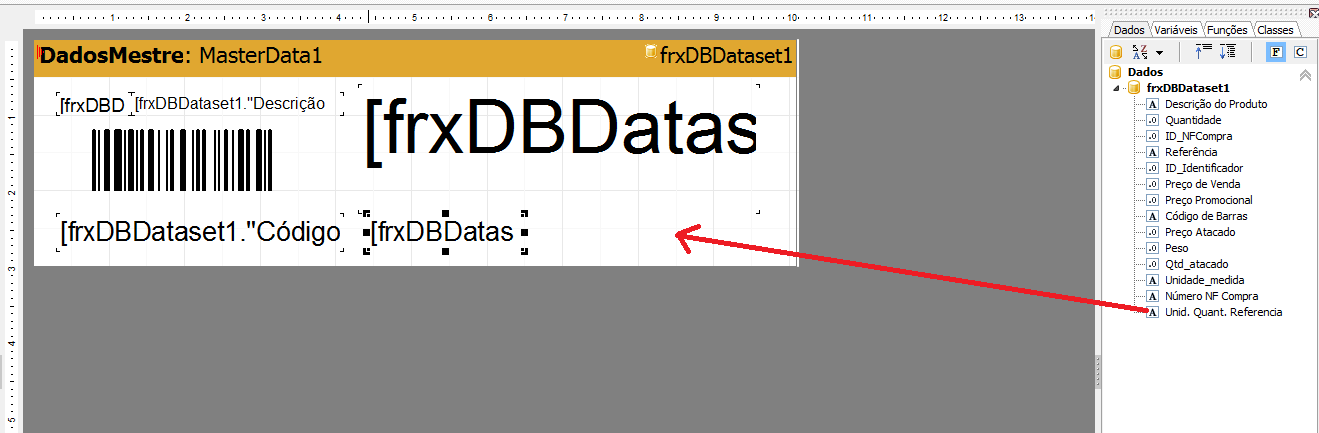 Localize ao lado direito da tela o identificador Unid. Quant. Referencia, clique no campo e arraste para dentro da etiqueta;