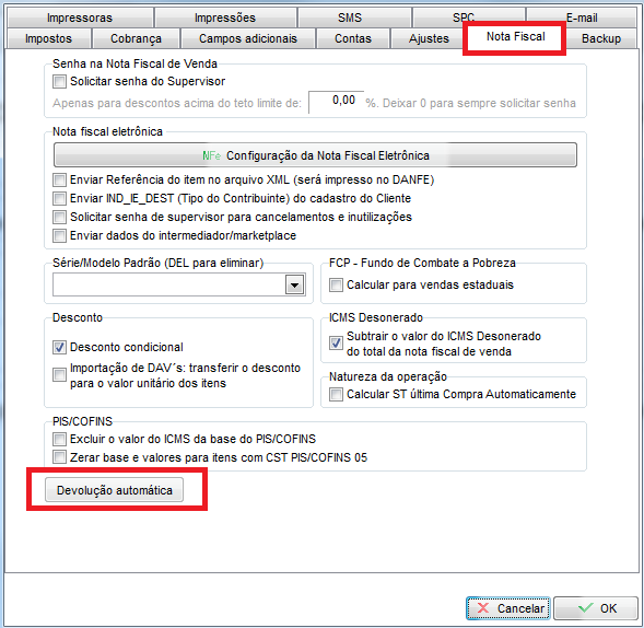 Primeiramente é necessário configurar o CFOP e série padrão para envio das devoluções, para isso, acesse Configurações - Parâmetros - Nota Fiscal e clique em Devolução Automática;