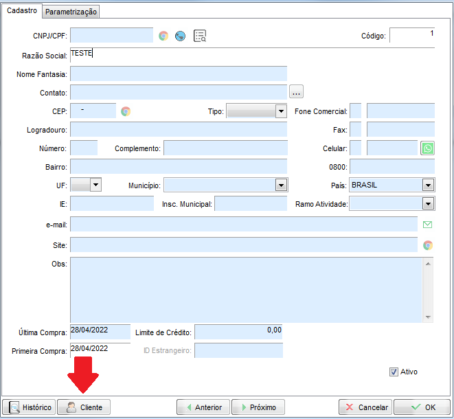 Primeiramente cadastre o fornecedor como cliente, acessando o cadastro do mesmo e clicando na opção Cliente;