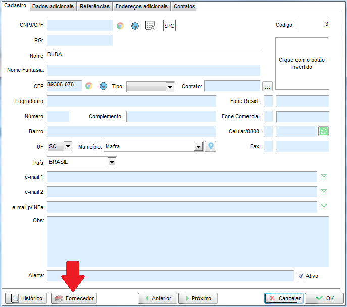 O processo é o mesmo, abra o cadastro do cliente e clique no botão Fornecedor;