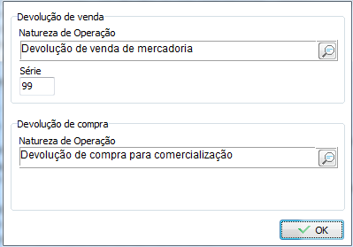 Conforme exemplo abaixo, você poderá definir as naturezas de operação de devolução de venda e de compra, para o caso da devolução de venda, será necessário preencher a série que você utiliza nas vendas. Atenção! Caso não saiba as naturezas que precisa definir, contate sua contabilidade.