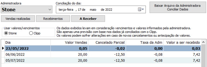 Caso marque para o sistema se embasar nos valores e vencimentos da Stone, serão exibidos os dados levando em consideração os vencimentos e valores informados pela administradora (Stone). São apenas uma precisão com base nos dados já conciliados anteriormente no sistema e esses valores podem sofrer alterações em casos de novos cancelamentos ou antecipação de valores.