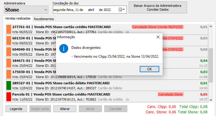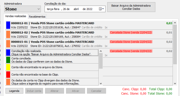 De acordo com a situação de cada conta, comparando com o que retorna da Stone é indicado a divergência ou pendência. Exemplo, vendas em azul não estão conciliadas, vermelhas são contas que não foram encontradas na base do Clipp, conforme legenda.