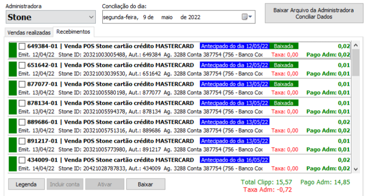 Ao solicitar a antecipação no painel da Stone, no próximo dia útil será feito o pagamento por parte da Stone, no Clipp é identificado que é referente a antecipação e permitirá vincular aos documentos e efetuar as devidas baixas sem causar divergências. As vendas antecipadas são identificadas também, veja exemplo: