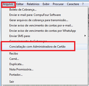 Para acessar a conciliação, clique em Contas a receber - Arquivo - Conciliação com administradora de cartão;