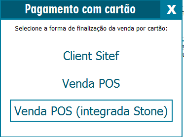 Durante a venda, na parte de pagamentos, escolha a opção cartão e siga até a opção Venda POS (integrada Stone);