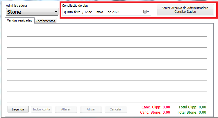 Escolha a data da conciliação e clique em Baixar Arquivo da Administradora Conciliar Dados;