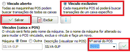 Sobre o Vinculo exclusivo: Após informar o Stone Code e o ID do estabelecimento (gerado pela Stone), marque vínculo exclusivo e clique em Salvar, em seguida digite o número do serial do POS