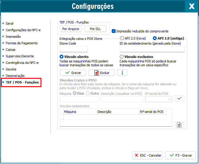 Para configurar no emissor de NFCe, pressione a tecla F10 e siga até a opção TEF / POS - Funções, é neste local que você irá configurar suas credenciais da Stone.