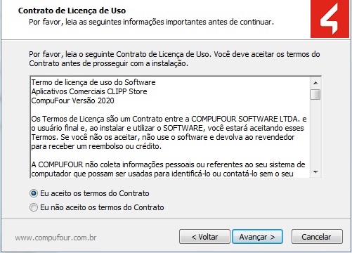 Na próxima tela, será disponibilizado os termos de contrato, leia com atenção e caso concorde, marque a opção Eu aceito os termos do contrato e clique no botão Avançar.