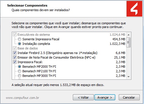Em seguida escolha quais componentes serão instalados e qual o modelo da Impressora Fiscal (caso utilizar). Sugerimos que sejam marcadas todas as opções e a Impressora Fiscal (caso utilizar). Feito isso clique em Avançar.