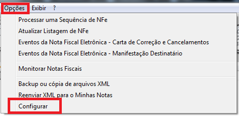 Para a NFe, acesse o gerenciador de NFe e clique em Opções - Configurar;