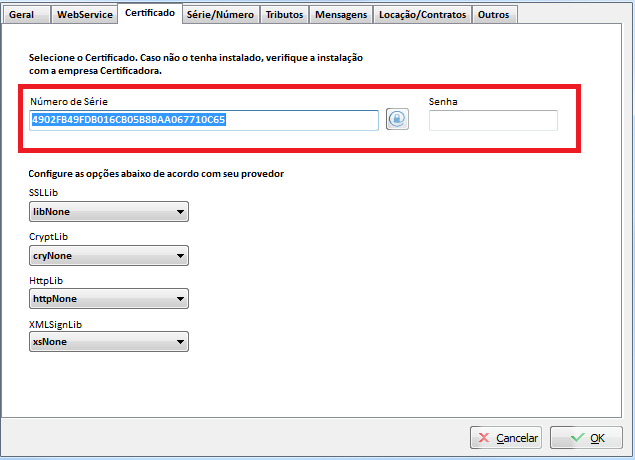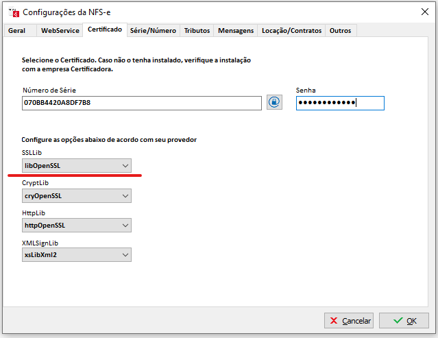 Na aba Certificado, defina libOpenSSL nas configurações do provedor;