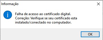 Falha de acesso ao certificado digital. Correção: Verifique se seu certificado está instalado/conectado no computador.