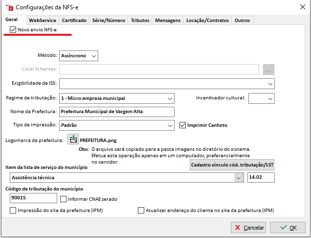 Caso persista, marque Novo Envio NFS-e na aba Geral;