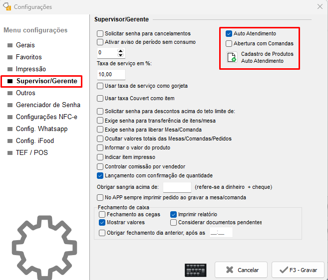 Acesse as configurações do ClippCheff clicando no botão  clique na aba Supervisor/Gerente, marque a opção Auto Atendimento, em seguida, clique no botão  para abrir a tela de cadastro dos produtos para o Auto Atendimento;