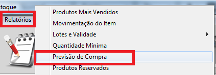 Com base no estoque atual e compras efetuadas, esse relatório é gerado para previsão de compras futuras. Lembrando que no relatório pode-se incluir produtos sem movimentação, fornecedor preferencial ou produtos com quantidade mínima menor.