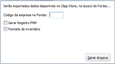 Aqui você precisará informar o código da empresa no sistema Fortes (composto por 4 caracteres), caso queira, poderá gerar o registro PNM e também em formato de inventário;