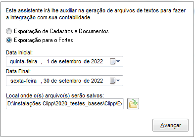 Após execute o mesmo e marque a opção Exportação para o Fortes, defina a data inicial e final que serão consideradas e defina o local para salvar o arquivo;