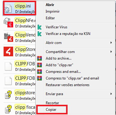Em seguida, abra a pasta Clipp que for apresentada, a qual foi compartilhada automaticamente pela instalação feita no computador Servidor, localize o arquivo Clipp.ini (ou apenas Clipp), clique com o botão direito no mesmo e clique na opção Copiar;