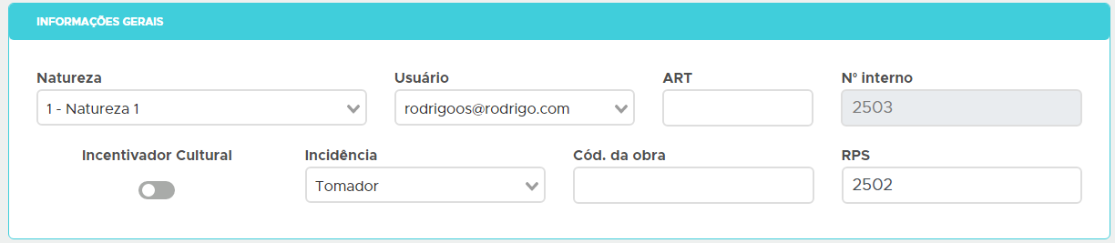 Usuário - Informe o e-mail do usuário do sistema que emitiu a nota;