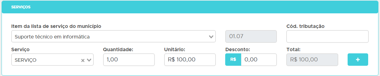 Informe aqui o serviço prestado, quantidade, valor unitário e desconto (caso tenha), lembre-se de clicar no botão para adicionar o serviço!