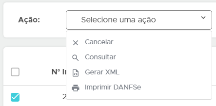 Marcando a nota e clicando no botão Ação você terá a possibilidade de cancelar a nota (somente se estiver com status de Autorizada), consultar (para consultar o status da nota no servidor da prefeitura e comitar no sistema), gerar XML e imprimir DANFSe.