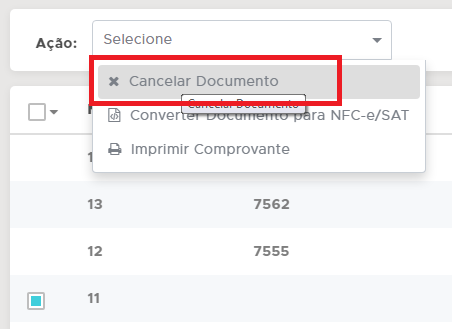 Caso queira cancelar o documento, marque-o, clique em Ação - Cancelar Documento;