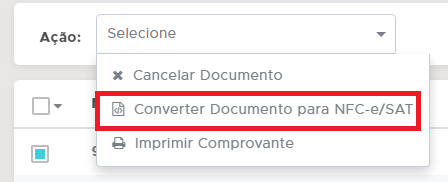 Para emitir a NFCe/SAT relativa a saída gerencial, marque o documento e clique no botão Ação - Converter documento para NFC-e/SAT;