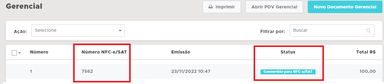Após a conversão, constará o número da NFC-e/SAT para onde foi o documento gerencial e o status será alterado para Convertido para NFC-e/SAT;