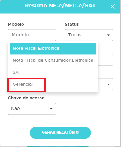 Outro relatório está disponível em Relatórios - Fiscal - Resumo NF-e/NFC-e/SAT, aqui você poderá escolher o modelo gerencial para que apresentem as movimentações efetuadas no módulo gerencial;