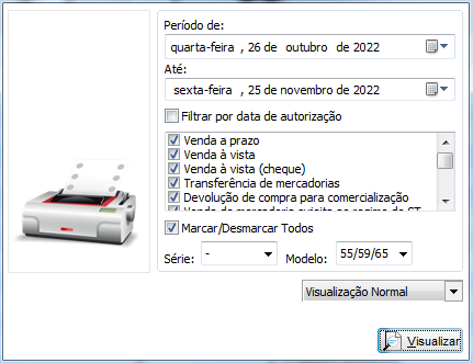 Será possível escolher o período, se deseja considerar documentos por data de autorização (caso deixe desmarcado, irá considerar a data de emissão), será possível também escolher as naturezas de operação consideradas no relatório, série e modelo(s) na exibição do relatório.