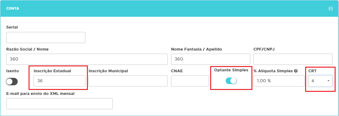 Na aba Conta (além dos demais dados) efetue o preenchimento da Inscrição Estadual de sua Micro Empresa Individual, marque a chave Optante Simples e selecione o CRT 4;