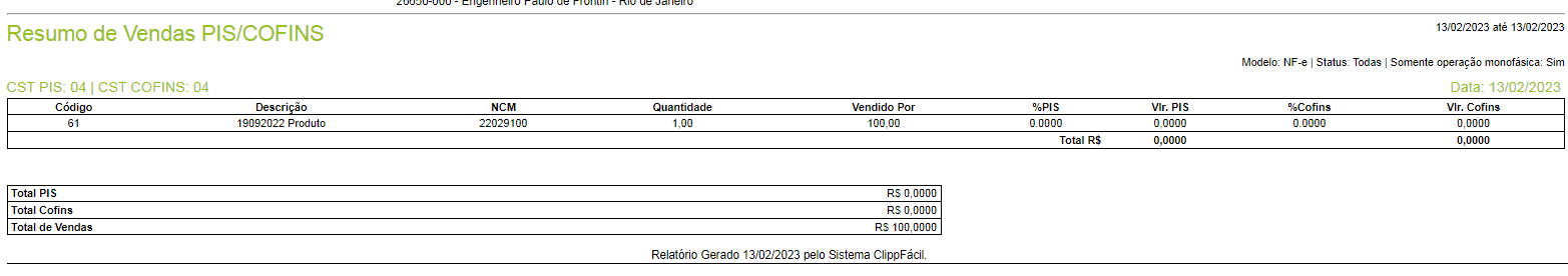 Os produtos monofásicos estão correspondidos pelo uso do CST PIS e COFINS como 04 - Tributação Monofásica, as vendas que foram efetuas com essa condição serão apresentadas neste relatório.