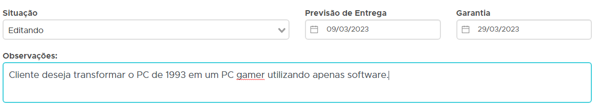 Na aba Informações Adicionais lance a situação, previsão de entrega, prazo da garantia e observações gerais da ordem de serviço;