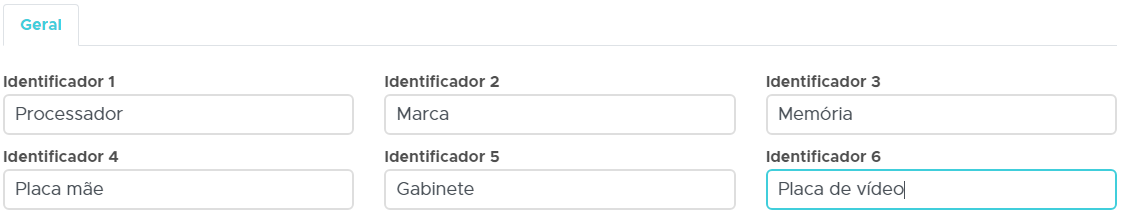 No cadastro de identificadores você lançará o nome dos campos relativos ao objeto, para preenchimento posterior, por exemplo: Marca, modelo e demais detalhes pertinentes.