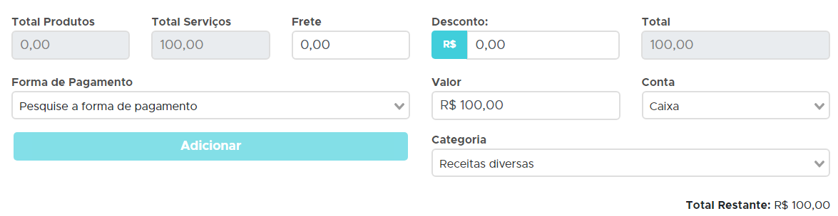 Na aba Formas de pagamento, indique o pagamento das peças e serviços prestados, após lançar a forma de pagamento, não esqueça de clicar no botão Adicionar;