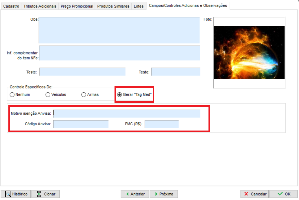 Em seguida, abra o cadastro do item, clique na aba Campos/Controles adicionais e observações, marque a opção Gerar "Tag Med" e preencha o Código Anvisa e PMC R$ (Preço máximo ao consumidor, que é o preço máximo pelo qual as farmácias e drogarias podem praticar ao vender para o consumidor.)
