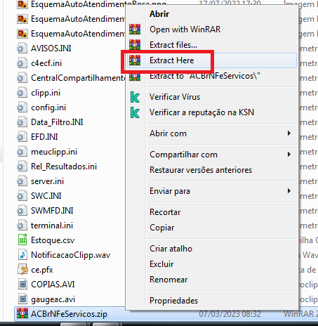 Agora, localize o arquivo colado na pasta, clique com o botão direito nele e descompacte-o, clicando no botão extrair aqui;