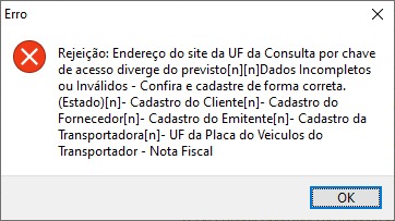 Rejeição: Endereço do site da UF da Consulta por chave de acesso diverge do previsto