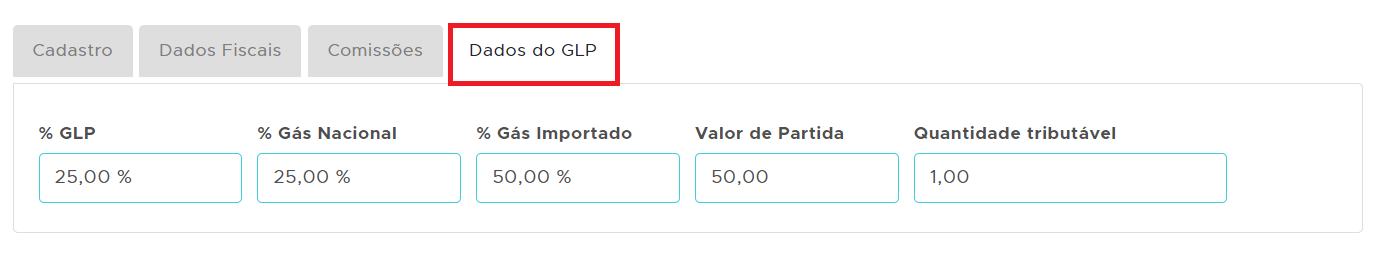 Após isso, acesse a aba Dados do GLP e faça o preenchimento dos percentuais de GLP, Gás Nacional e Gás Importado, a soma dos percentuais informados nesses 3 campos deve ser 100%, em caso de dúvidas no preenchimento, contate sua contabilidade ou o fabricante do gás.