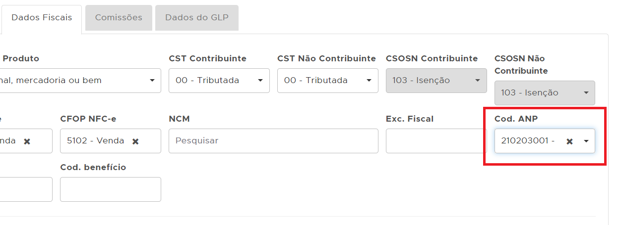 Em seguida, clique na aba Dados Fiscais e confira o preenchimento do Código. ANP;