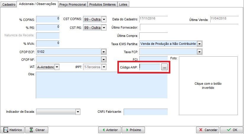 Após efetuar o download da tabela, abra seu cadastro de estoque - aba adicionais/observações e confira o campo código ANP;