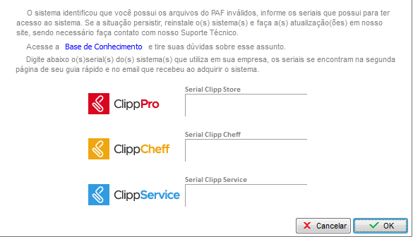 Assim que for aberto seu Clipp Store e aparecer a mensagem do PAF-ECF inválidos, informe apenas os seriais referentes aos produtos adquiridos pela sua empresa, posteriormente clique no OK para que seja realizada a abertura do programa.